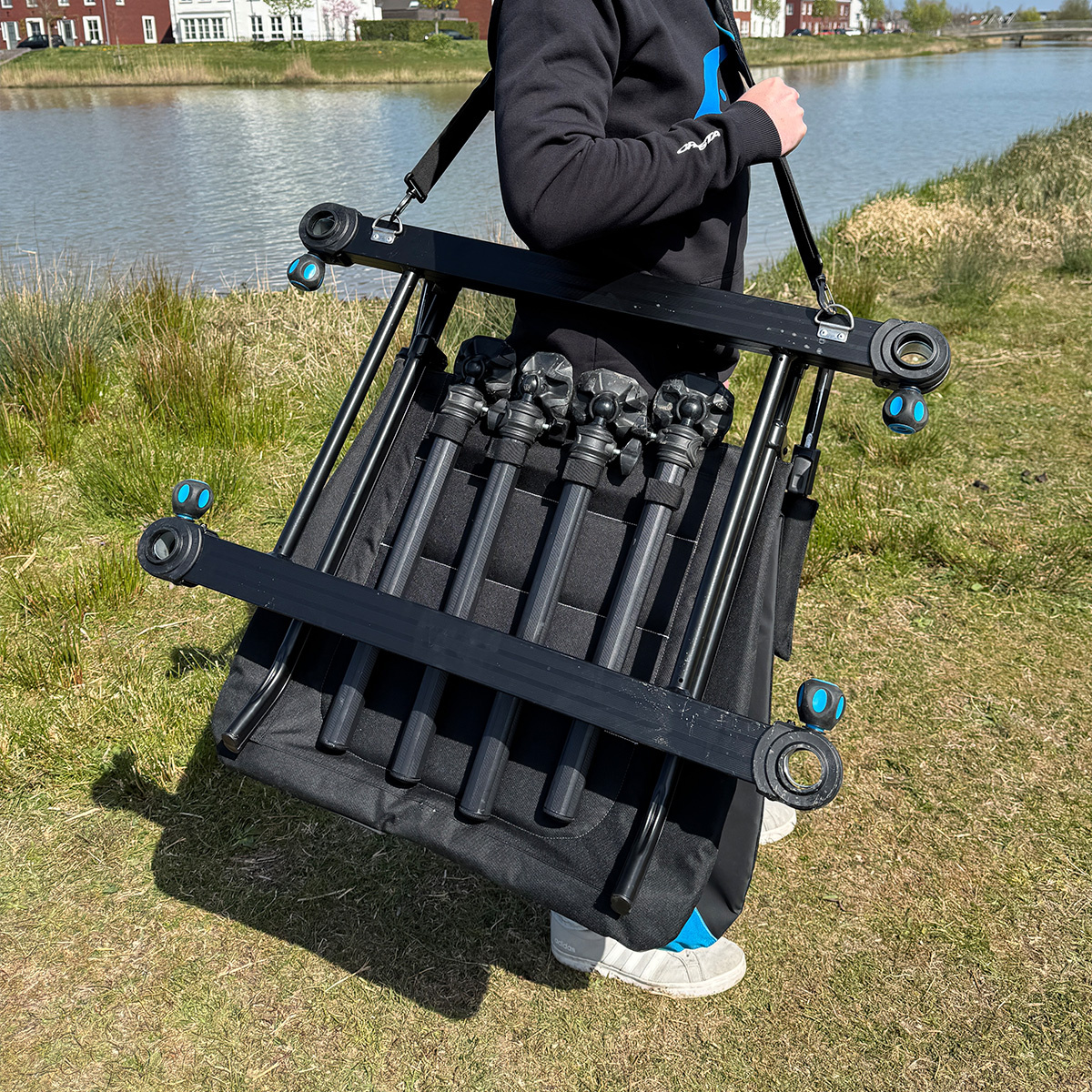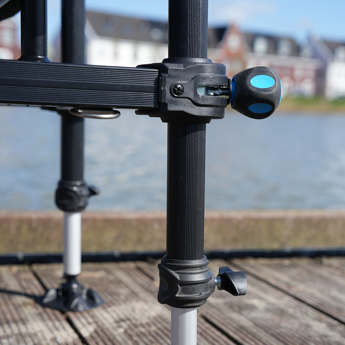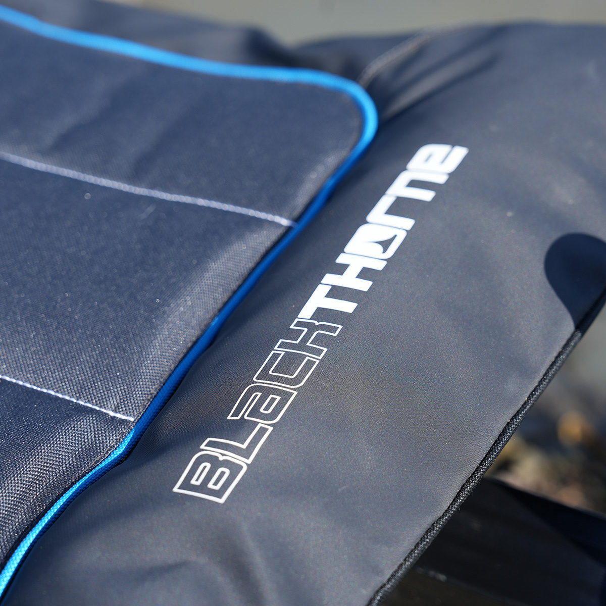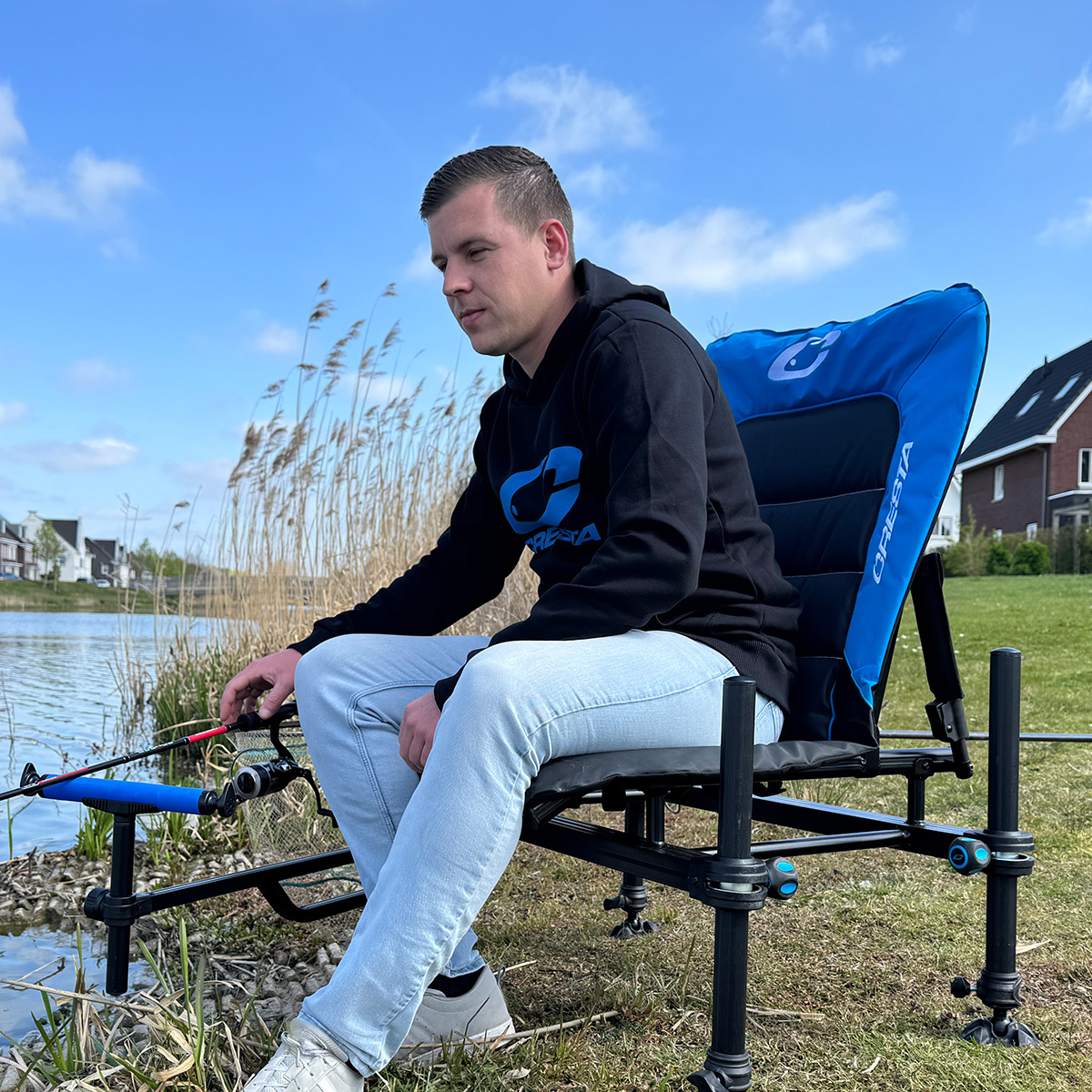 "De Blackthorne Supa Chair biedt maximaal zitcomfort aan de waterkant. Het brede zitvlak dat het frame royal overlapt, is voorzien van de een zachte voering, terwijl de hoogte van de matras zorgt voor optimale ondersteuning van de rug. Dankzij de traploos instelbare rugleuning is altijd de ideale positie te bereiken. Het stabiele aluminium frame is voorzien van vier 36mm, telescopische poten met meebewegende moddervoeten. Hierdoor is deze stoel op iedere ondergrond stabiel en op de gewenste hoogte te plaatsen. De 4 poten worden volledig rondom vastgeklemd en kunnen gemakkelijk worden aangedraaid met de 4 ergonomische en draaibare sluitknoppen. Op de poten kunnen hengelsteunen en andere hulpstukken, zoals feederarmen en aastafels gemonteerd worden. Op de bovenkant van iedere poot bevindt zich bovendien een schroefdraad. Door de rugleuning in te klappen en de poten op achterkant van de rugleuning te plaatsen, ontstaat een prettig en compact transportformaat. Dankzij de gevoerde en afneembare schouderband en het geringe gewicht van slecht 8.1kg kan de Blackthorne Supa Chair gemakkelijk gedragen en vervoerd worden.