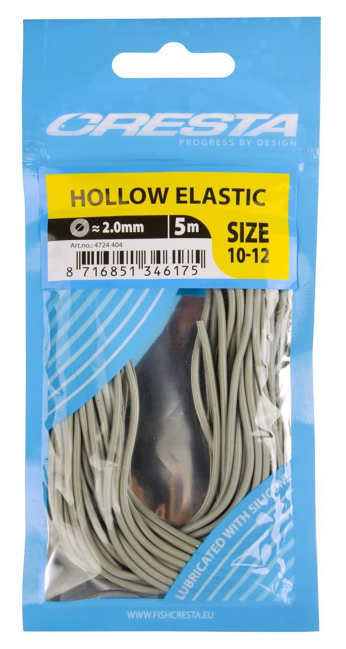 Dit hoogwaardige en slijtvaste elastiek bezit een holle kern waardoor het rekpercentage ten opzichte van conventionele elastiek veel hoger is. De meerekkende buitenmantel is voorzien van een opvallende kleur, zodat de zwemrichting van een gehaakte vis goed zichtbaar is. Ook is hieraan de diameter te herkennen. Dit elastiek is zeer geschikt voor het gebruik in een zogenaamde PullerKit. Dankzij de toegevoegde vloeibare siliconen wordt een lange levensduur gegarandeerd. Cresta Hollow Elastic is verkrijgbaar in 11 verschillende maten van 1,3 t/m 3,5mm. Zeer geschikt voor zowel karper, witvis als voor de visserij op stromend water.