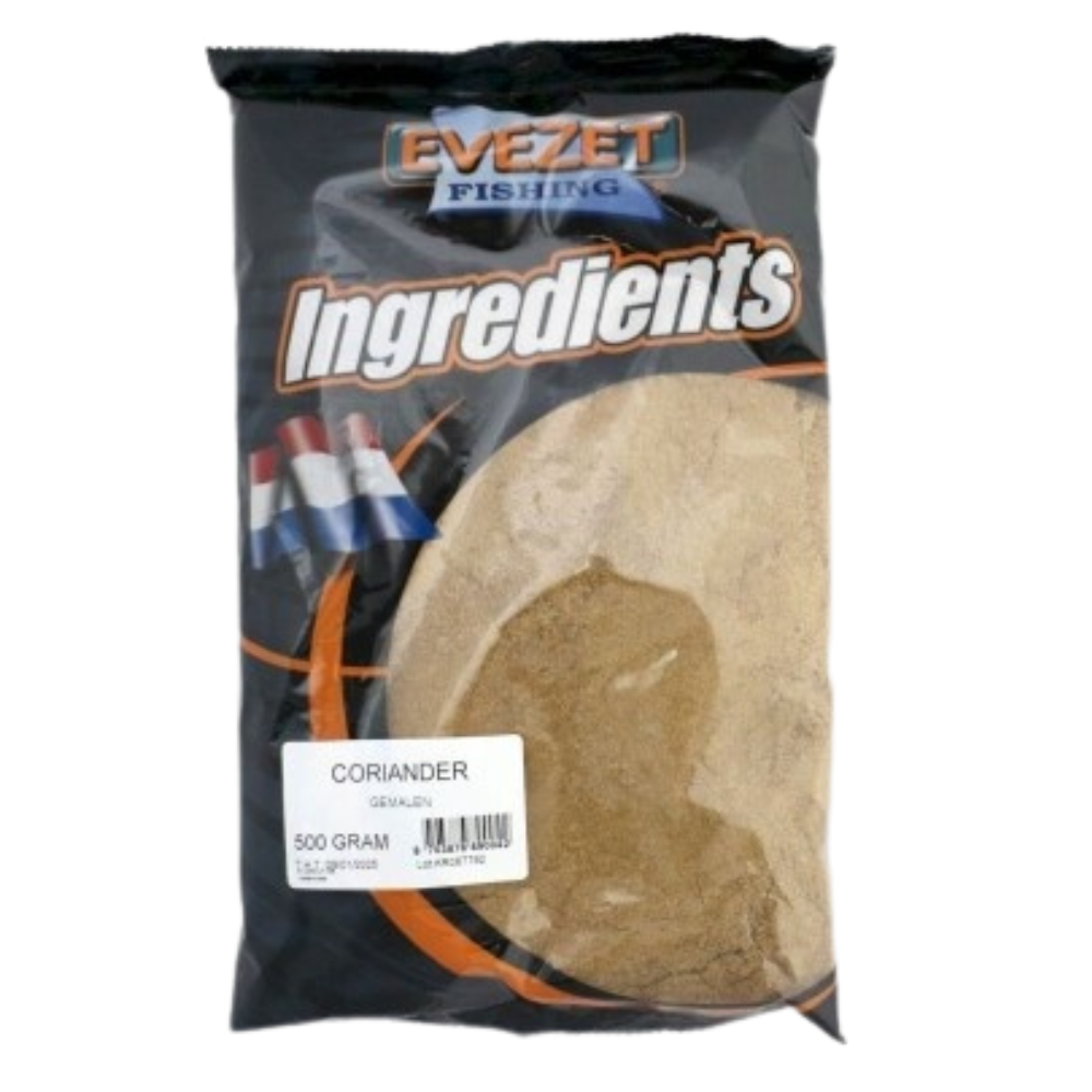 Is duidelijk een favoriete geurstof van veel wedstrijdvissers, Team Evezet vindt dit een absolute topper. In het voer heeft het de functie van geur- en smaakmaker. Bevordert sterk de spijsvertering en is geschikt in een bodem- en oppervlaktevoertje. Coriander heeft een laxerende werking. Het is niet voedzaam. Coriander is goed te combineren met vette, verzadigende meelsoorten zoals b.v. noten-, kokos- en koekmeel. Je mag Coriander wel ruiken in je voer maar zorg dat de hoeveelheid in je voer niet boven de 15 % uitkomt.