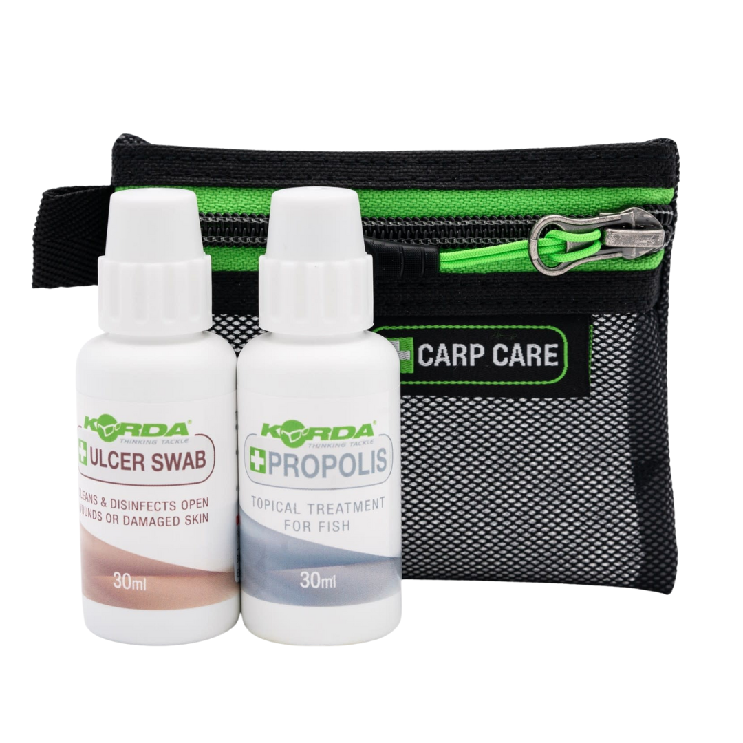 Als visser willen we elke gevangen vis zo goed mogelijk terugzetten, en de Carp Care Kit helpt zeker om dat te bereiken. Het wordt geleverd in een afsluitbaar zakje en bevat elk 30 ml Propolis en Ulcer Swab. De Ulcer Swab is ontworpen om wonden of zweren op de vis te reinigen en te ontsmetten, waardoor wordt voorkomen dat het gebied geïnfecteerd raakt door bacteriën of schimmels. Propolis, een natuurlijk product afkomstig van bijen met antibiotische en antimicrobiële eigenschappen, kan vervolgens worden aangebracht om het gebied af te sluiten en te voorkomen dat er iets in het gereinigde gebied komt. Wanneer ze samen worden gebruikt, geven ze beschadigingen de beste kans om te genezen. De kit bevat een flesje van 30 ml Ulcer Swab en 30 ml Propolis.