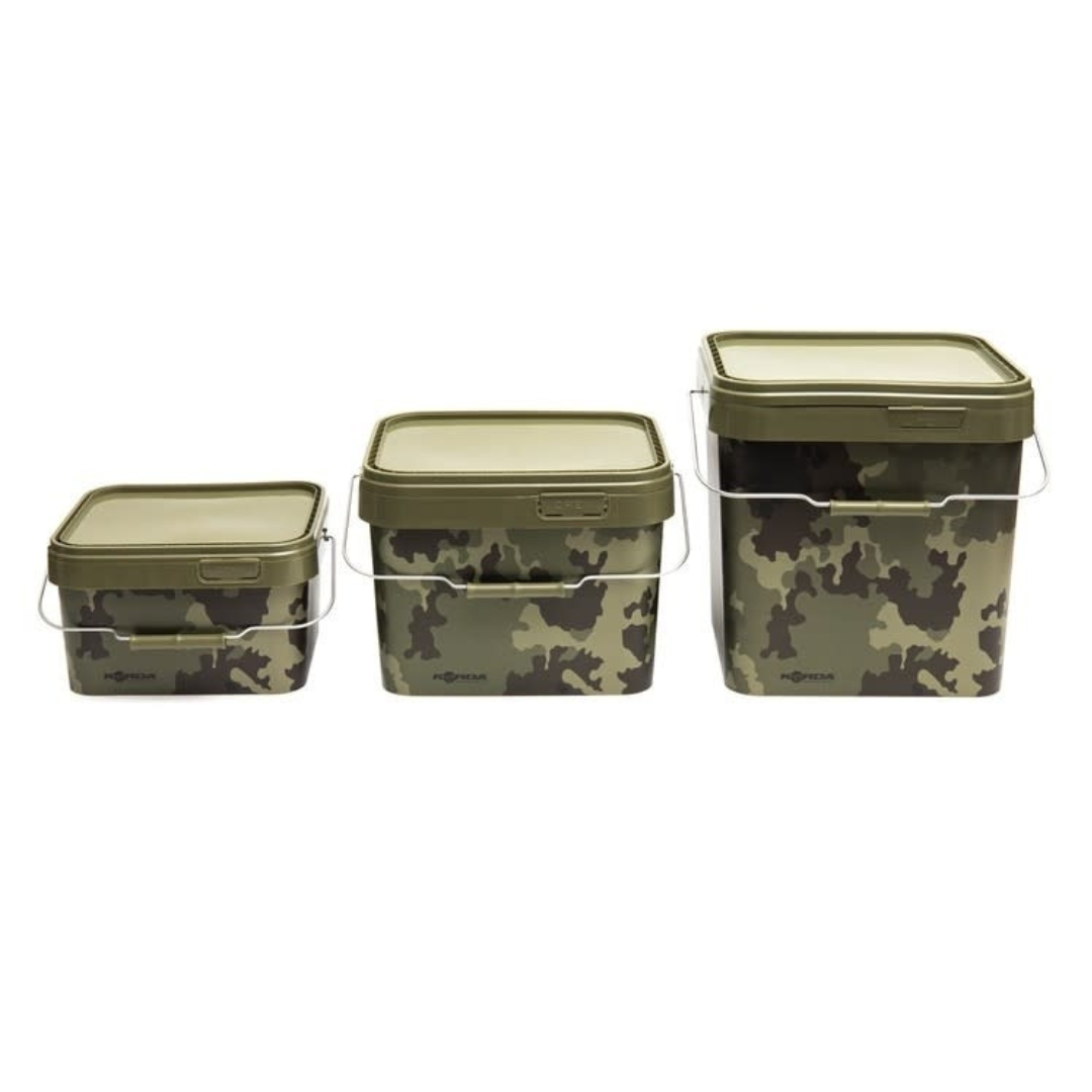 Er kan van alles in worden opgeslagen, maar ze zijn voornamelijk ontworpen als aascontainers, hoewel het grotere formaat ook kan dienen als zitje tijdens het stalken of als u een gast op uw visplek hebt, afhankelijk van het gewicht natuurlijk. De opstaande rand rond de deksel voorkomt dat er iets vanaf rolt, waardoor ze ook uitstekend werken als kleine bivvy-tafel.