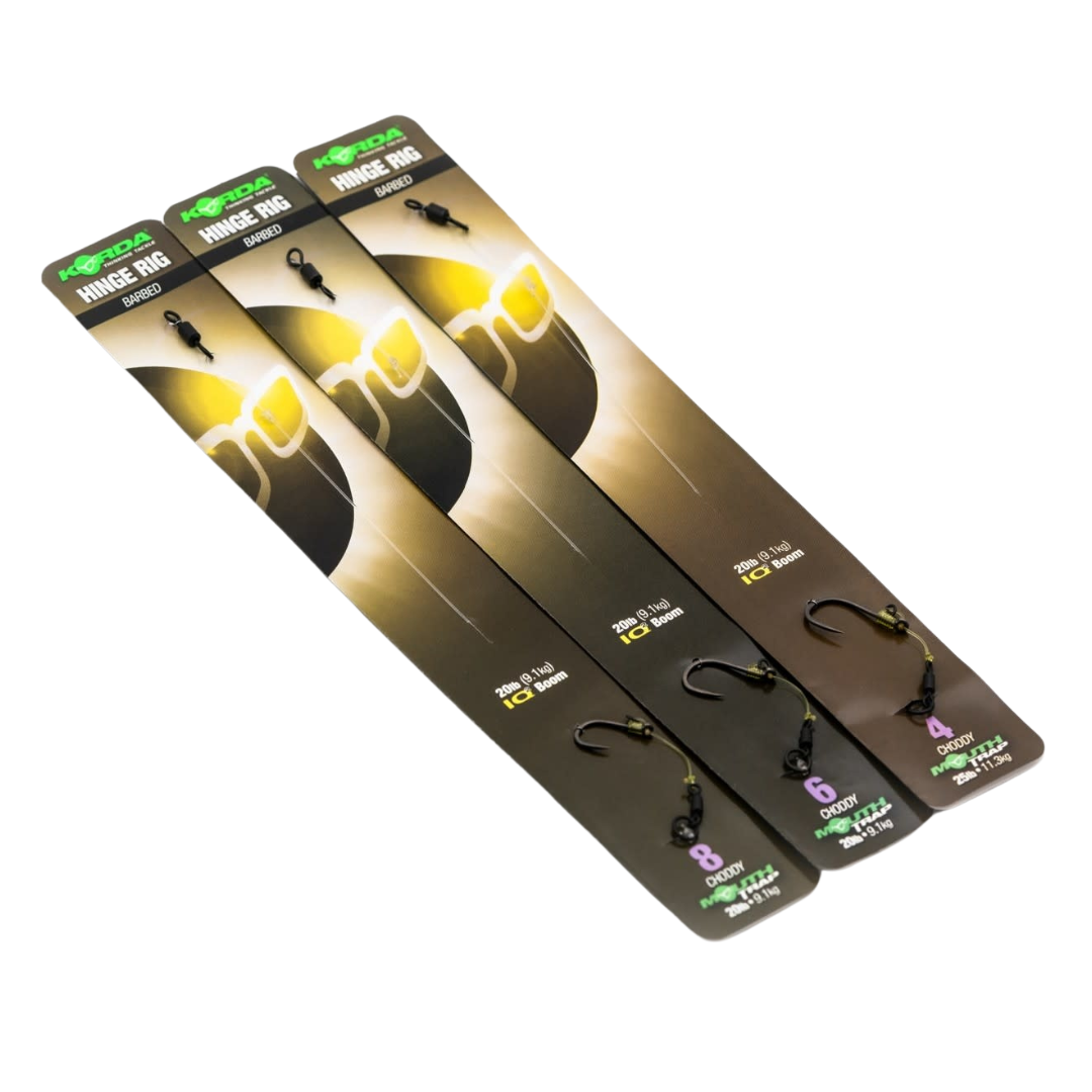 Sommige vissers voelen zich onzeker als het gaat om het knopen van ingewikkeldere rigs zoals de Hinge Rig, maar dat hoeft nu niet meer, want u kunt een kant-en-klare versie kopen die precies is opgezet zoals topvissers van Korda dat zelf zouden doen. De Hinge Rig is een geweldige opstelling voor het vissen met pop-ups verder van de bodem (in vergelijking met een Spinner Rig) en u kunt er zeker van zijn dat het niet in de war raakt en altijd effectief vist, zolang de bodem schoon is, dankzij het stijve boommateriaal dat het van uw lood duwt en het in staat stelt opnieuw in positie te komen als het door een karper wordt opgepakt en losgelaten. Het is opgebouwd van Mouth Trap tot een Choddy haak aan het uiteinde, die perfect gebogen is voor het beste inhaakpotentieel, en een boom gemaakt van IQ-fluorocarbon, zodat het onopvallend is op de bodem van het meer. De Hinge Rig is verkrijgbaar met weerhaak of zonder weerhaak, in maat 4 tot 25lb; maat 6 tot 20lb; of maat 8 tot 20lb. U krijgt één rig in een verpakking.