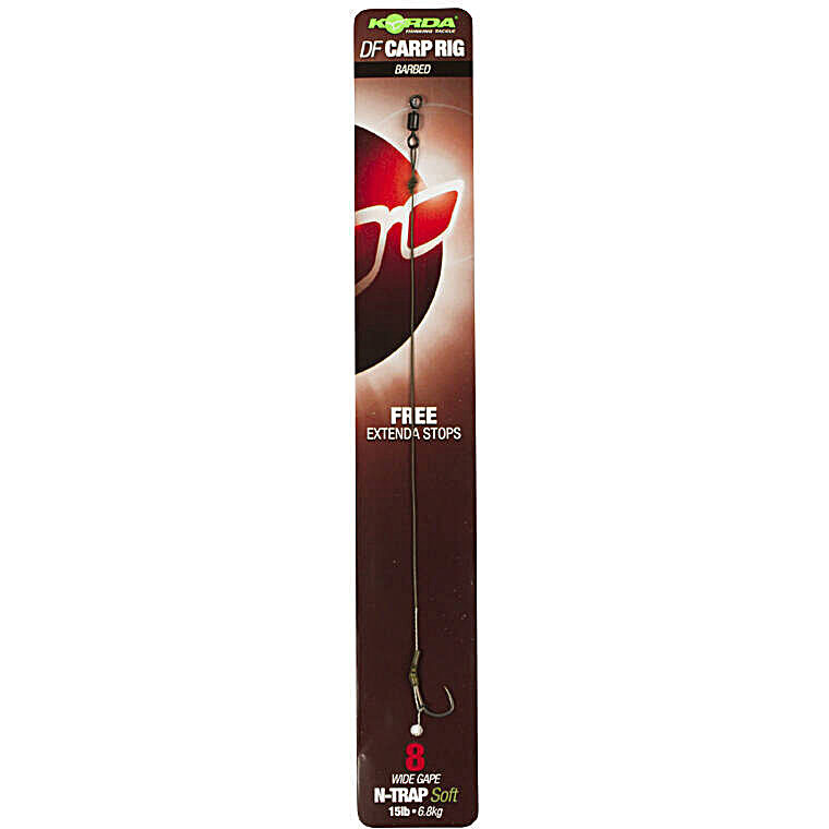 Het is nog nooit zo makkelijk geweest om een van de favoriete rigs van Korda-baas Danny Fairbrass te gebruiken, want er is nu een kant-en-klare DF Carp Rig verkrijgbaar, die precies zo is geknoopt als hij het zelf zou doen, met dezelfde onderdelen. Dit is een zeer effectieve rig die gebruikt kan worden met bodemaas, wafters of zelfs pop-ups (met een extra contragewicht). De blowback-ring op de haaksteel, plus een stukje krimpkous om de haak een agressievere houding te geven, zorgen voor een groot inhakingspotentieel.