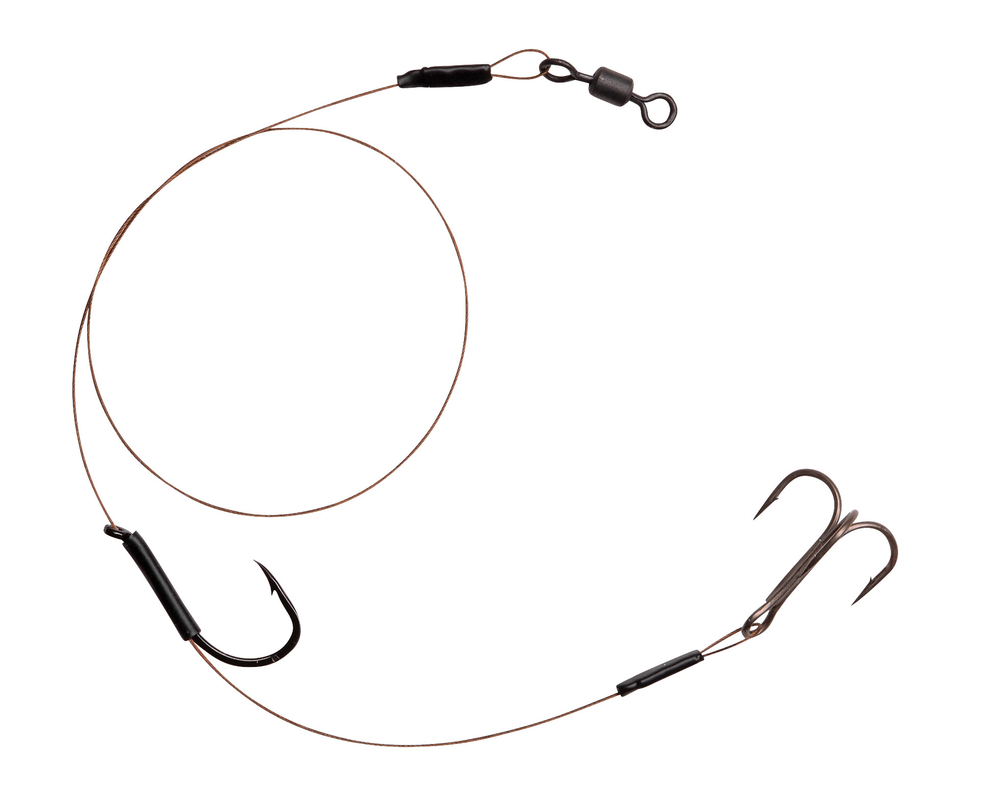 Topkwaliteit aasvisrig, gemaakt van camouflagebruin AFW ( American Fishing Wire ) in 7x7 RVS. De 1300-serie is gemaakt met 1 vaste Gamakatsu-dreg en een enkele schuivende haak. Prima rig voor kleine tot middelgrote aasvissen. Afgewerkt met krimpkous.